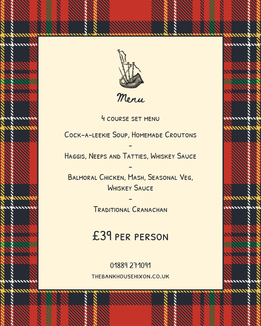 Join us for a cosy celebration of Scotland’s most beloved bard with a specially crafted four-course Burns Night menu, served exclusively on Friday 23rd and Saturday 24th January.
